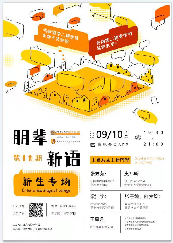 为了帮助新生熟悉校园,进一步了解大学生活,熟悉专业知识,2021年9月10日19:30,由班级联合会承办的第十九期“朋辈新语”以线上会议的形式顺利开展。