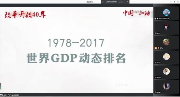 主持人赵秋吉同志放映两段改革开放的视频,从视频中,各位同志一起感受到了中国的“速度与激情”!改革开放40年来,中国经济和社会发展取得了举世瞩目的成就——经济增速明显高于世界平均水平、对世界经济增长的贡献跃居全球首位、国内生产总值稳居世界第二位、货物进出口总额跃居世界第一位、贫困人口大幅减少……中国的发展超乎想象,堪称世界奇迹。