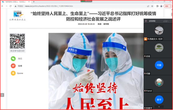 2022年4月13日15时,伟德体育官网博士党支部采用腾讯会议召开组织生活会,深入学习贯彻“始终坚持人民至上、生命至上”——习近平总书记指挥打好统筹疫情防控和经济社会发展之战述评。