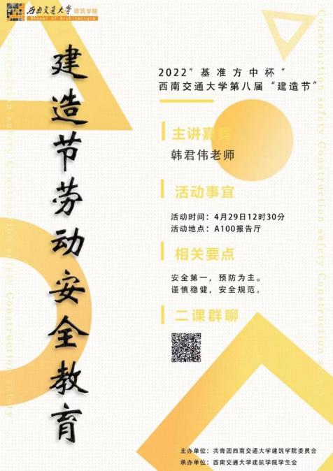 伟德体育官网高度重视“建造节”学生安全工作,就安全问题专门召开工作协调会进行强调和工作布置。在本次“建造节”正式搭建环节之前,为提高参赛同学的安全防范意识,普及安全教育知识,2022年4月29日,由伟德体育官网团委主办、伟德体育官网团委学生会承办的西南交通大学第八届“建造节”劳动安全教育培训会在学院A100报告厅顺利举行。