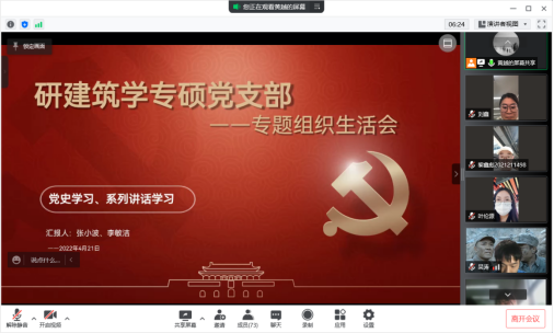 2022年4月21日19时,西南交通大学伟德体育官网研建筑学专硕党支部于腾讯会议召开“党史学习与习近平总书记系列重要讲话学习”主题生活会,支部党员及入党积极分子参加了本次会议,会议由黄越同志主持。