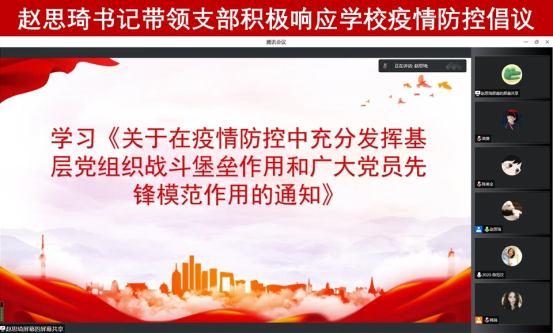 议题三是学习《关于在疫情防控中充分发挥基层党组织战斗堡垒作用和广大党员先锋模范作用的通知》。为更好的贯彻落实疫情防控工作要求,凝聚支部力量,支部书记赵思琦同志带领研风景园林党支部深入学习《关于在疫情防控中充分发挥基层党组织战斗堡垒作用和广大党员先锋模范作用的通知》,积极响应学校疫情防控倡议。并号召全体党员在疫情防控期间以身作则,严守纪律,自己做好疫情防控的同时,带动身边同学配合学校各项防疫工作,发挥党员的先锋模范作用,积极参与疫情防控志愿服务工作。