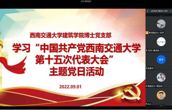 2022年09月01日下午3点00分,我院博士党支部采用腾讯会议组织召开学习中国共产党西南交通大学第十五次代表大会精神主题党日活动,深入学习贯彻会议精神。