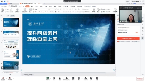 会议第二部分,杨珂老师带领大家一起进行了以“提升网络素养,理性安全上网”为主题的网络安全教育与学习。杨珂老师从网络素养及其特征、大学生网络失范行为与案例分析、大学生如何提升网络素养三个方面进行讲述。
