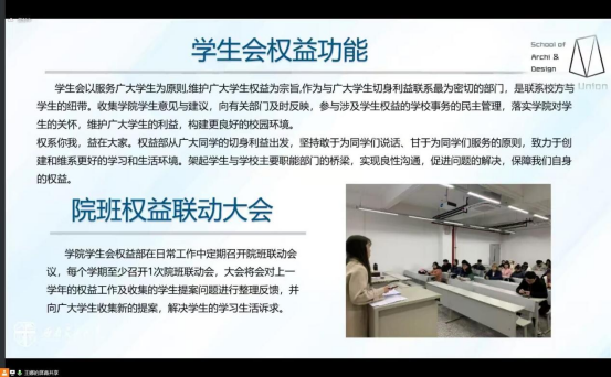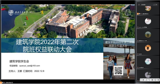 为了做好学校和学院联系广大同学的桥梁和纽带,增强学生会服务同学的功能,反馈学生学习与生活方面的诉求,切实维护学生权益,更好地建设校园环境,由西南交通大学校学生会主办、伟德体育官网团委学生会承办的伟德体育官网2022年第二次院班权益大会于2022年12月8日下午16点通过线上腾讯会议的方式进行。本次大会由学生会权益部部长王娜同学主持,邀请校学生会权益实践部成员,学生会主席团成员盛雨帆、朱泓霖同学,学生会权益部成员,19级、20级、21级和22级各班权益生活委员参与会议。
