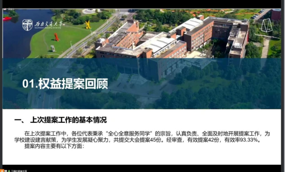 大会第二项议程为回顾权益提案。王娜同学表示,在前期提案工作中,各位代表秉承“全心全意服务同学”的宗旨,积极开展提案工作,为学校建设建言献策,为学生发展凝心聚力,共提交大会提案45份。经审查,有效提案42份,有效率93.33%。