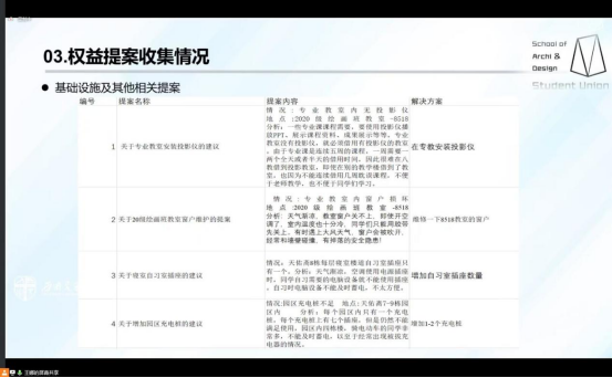 大会第三项议程为介绍权益提案反馈、解决情况。王娜同学针对同学们对于学校教学楼、寝室楼、食堂等区域的意见与建议作出明确答复并指明解决方案,力求“事事有回应,件件有着落”,彰显务实高效的工作态度。同时,王娜同学指出权益提案的提出没有时效性,学院学生会全年接受大家的权益问题,希望同学们积极提出。