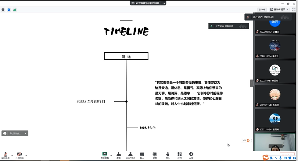 紧接着杨珂老师又帮助同学们梳理了2022年9月到新学期开始的时间线。并且针对于“懒惰”“拖延”等情况,告诫大家:”其实懒惰是一个特别奇怪的事情,它使你以为这是安逸、是休息、是福气。实际上给你带来的是无聊、是消沉、是倦急,..它剥夺你对前程的希望,隔断你和别人之间的友情,使你的心胸日益的狭窄,对人生也越来越怀疑。