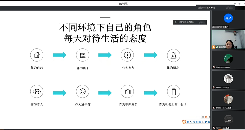 随后杨珂老师分别学生应该如何看待自己的角度出发,提出了研究生作为自己,应该对生活的负责,始终以积极的态度面对生活;作为孩子,应该善待父母,主动承担家庭的责任;作为室友,应该珍惜短暂的相遇;作为朋友,应该互相帮扶;作为恋人,应该具有责任感,朝着良性的方向发展;作为班干部,以身作则,团结同学;作为中共党员,紧密向组织靠拢,常要进行自我反思;作为社会上的一份子,应该努力提升自我价值”。