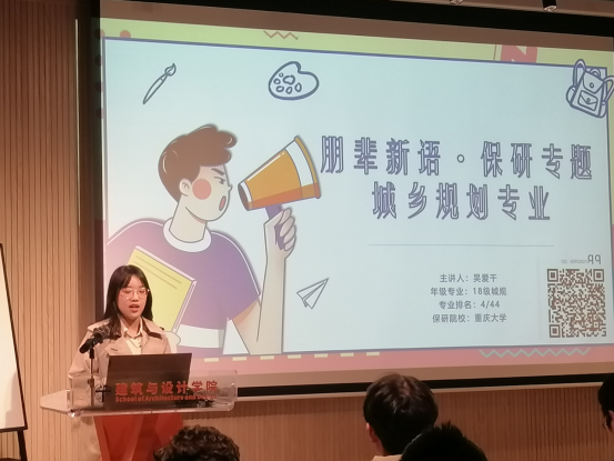分享会上,徐宇飞同学与大家分享了他的个人保研经验,为大家讲解了建筑学专业保研所需的各阶段准备,并列出时间线,使参会同学对保研流程有了更加全面的了解;吴爱千同学为参会者解读了城乡规划专业的保研政策,并细致介绍了不同高校的夏令营特色及所应做的相应准备;风景园林2018-01班的张润旋同学则为大家梳理了风景园林往年保研的概况,并分享了其个人保研经验,为低年级同学提供了个人建议;来自公共艺术专业的夏姿彤同学则从个人经历出发,更多地为大家介绍了跨专业学习、保研以及竞赛相关信息,为大家展示了她的部分作品以及运用个人优劣的经验。四位同学诚心准备,细心介绍,精心分享,参会同学受益匪浅