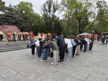 悼念仪式第二项,在研建筑学专硕第一党支部兰茂林同志的带领下,全体党员高举右手,重温入党誓词,共同回忆入党初心。誓词铿锵有力,回荡在陵园上空,饱含着同志们对党的忠诚和对革命先烈的敬仰。