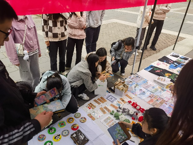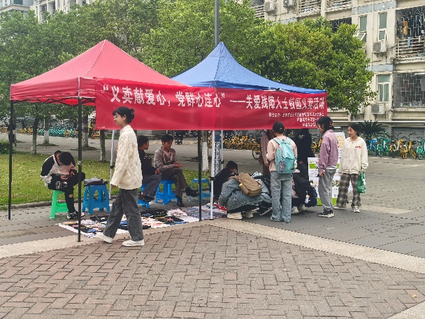 活动第二天,同志们在犀浦校区二食堂前进行校园义卖活动,活动现场暖意浓浓,吸引了大量师生参与,支部的同志们为前来的师生提供了热情周到的讲解与服务,让大家了解每一件手工艺品背后的故事和制作者的心意。此次义卖活动的顺利开展,为残障人士点亮了希望之光,让他们感受到了社会的温暖与关爱活动。所得到的义卖善款全部返还给机构,用于支持残障人士的生活和职业发展。