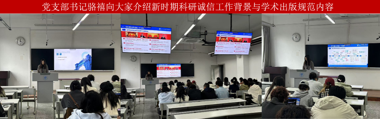 会议伊始,由党支部书记骆禧向大家介绍新时期科研诚信工作背景与学术出版规范内容。骆禧同志强调,科研诚信是科研工作的基石,在新的历史时期,加强科研诚信建设是落实党中央关于科技创新和学术进步的重要举措。骆禧同志进一步强调科研诚信的重要性及其在学术出版过程中的具体要求,呼吁全体党员同志以身作则,树立良好的学术道德风尚。