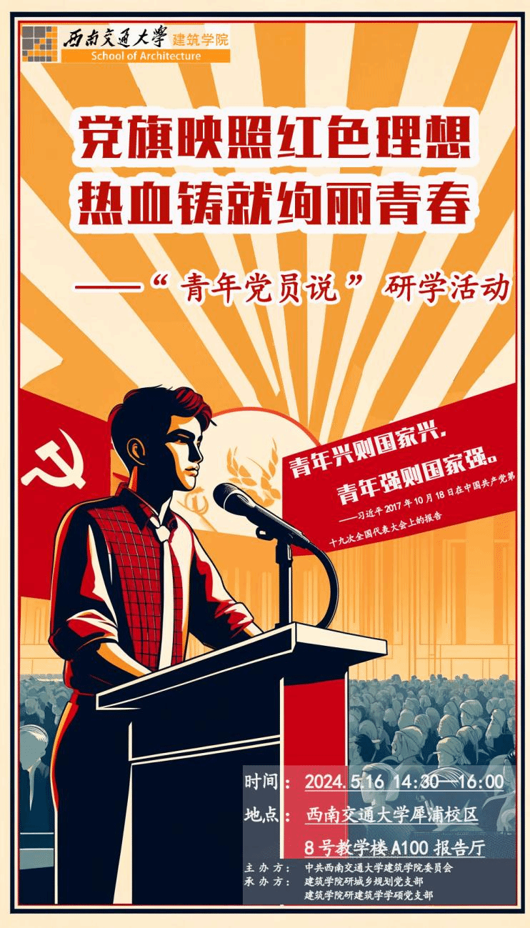 “青年兴则国家兴,青年强则国家强”,为号召广大青年党员不忘入党初心,加强青年党员思想交流,由中共伟德体育官网委员会主办,伟德体育官网研城乡规划党支部、伟德体育官网研建筑学学硕党支部承办的“党旗映照红色理想、热血铸就绚丽青春——‘青年党员说’研学活动”活动来啦!